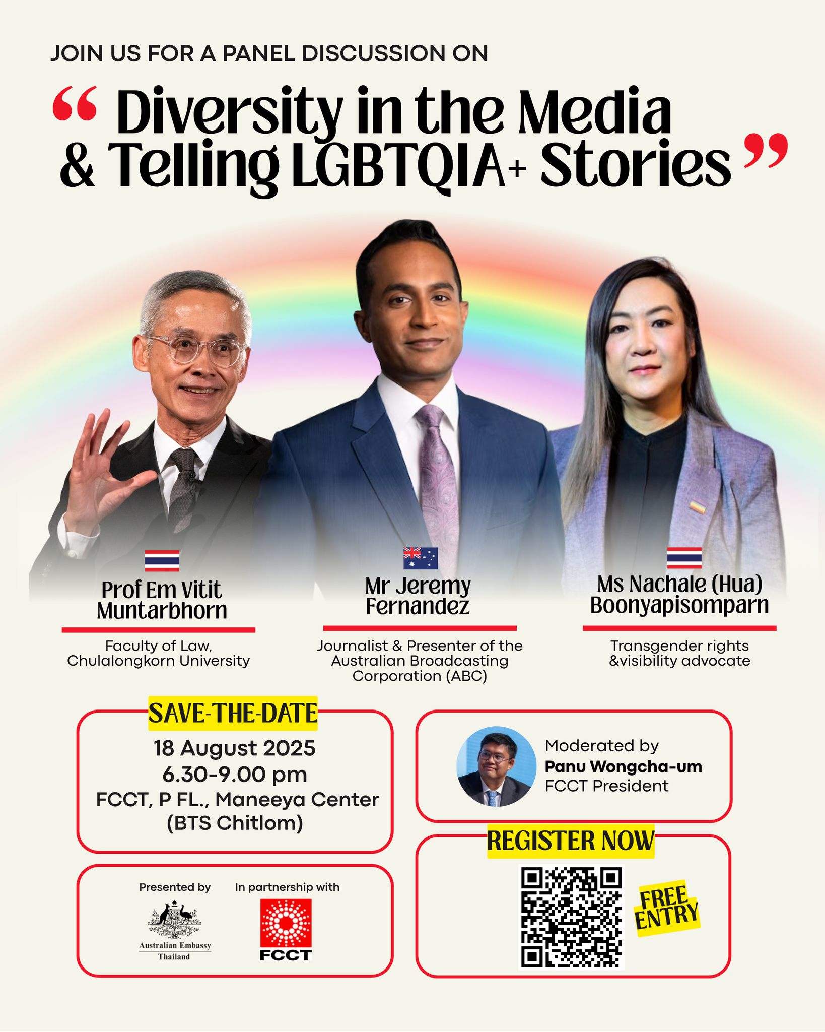 Ever wonder how media shapes the stories of LGBTQIA+ communities?We’ve partnered with the Foreign Correspondents' Club of Thailand for a thought-provoking panel discussion on diversity in the media and telling LGBTQIA+ stories.Hear from renowned ABC journalist Jeremy Fernandez who will lead the conversation, drawing from his extensive experience in inclusive storytelling and representation in mainstream media.He will be joined by leading law scholar and former UN independent expert on sexual orientation and gender identity Prof em Vitit Muntarbhorn and transgender rights and visibility advocate Hua Boonyapisomparn.Together, the panel will explore how media can better reflect the diversity of LGBTQIA+ experiences, challenge stereotypes and foster greater understanding and inclusion.Whether you're a media professional, student, activist or simply curious, this is a unique opportunity to hear from experts and engage in meaningful dialogue.Register now here.This is not an FCCT-organized event.Free and open to all.
