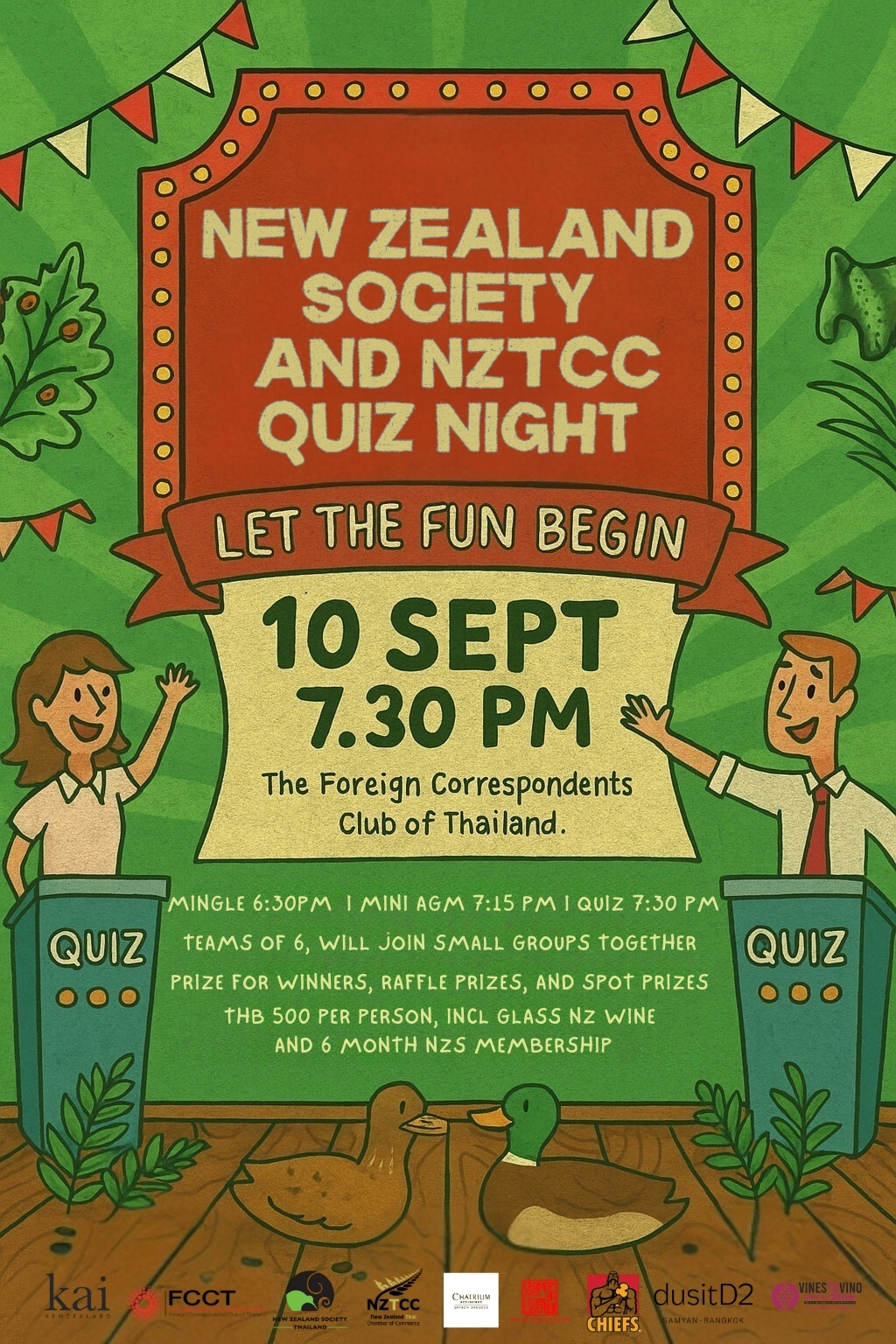 Get ready for an unforgettable evening of trivia, laughter and networking as the New Zealand Society Thailand, proudly supported by The New Zealand - Thai Chamber of Commerce - NZTCC, brings back the ever-popular quiz night!Form your dream team of 6 (or join a group on the night!) and compete in a lively quiz filled with challenging questions, fun facts and the chance to take home fantastic prizes.Tickets:500 THB (Includes 6 months NZS membership + 1 free drink -- NZ wine)What’s in store: