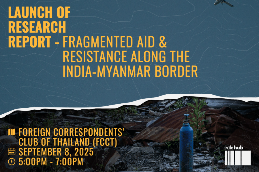 “Fragmented aid and resistance along the India–Myanmar border” is a new research report examining how refugees from Myanmar are navigating life in India’s northeast amid weak humanitarian responses and restrictive state policies. With international aid largely absent, local communities and grassroots networks have become the backbone of support.Since the 2021 coup, over 83,000 people have crossed into Mizoram and Manipur, yet there is no refugee protection framework and little international attention compared to the Thai–Myanmar border.The findings of this report show that while grassroots support networks have provided a critical lifeline, humanitarian assistance overall remains limited due to lack of funding and resources, poor coordination, political tensions, and the fact that access to support often is mediated by social and political affiliations. The recent suspension of $39 million in U.S. aid has further intensified the crisis, forcing many organisations to scale back or close operations.The event will include a presentation of key research findings, followed by a panel discussion featuring experts and frontline actors working at the intersection of humanitarian response, regional security, and political activism.To register for the event, please email kay@exilehub.org no later than 4th September 2025.Organised by Exile Hub, a feminist organisation supporting Myanmar human rights defenders.This is not an FCCT-organized event.Free and open to all.