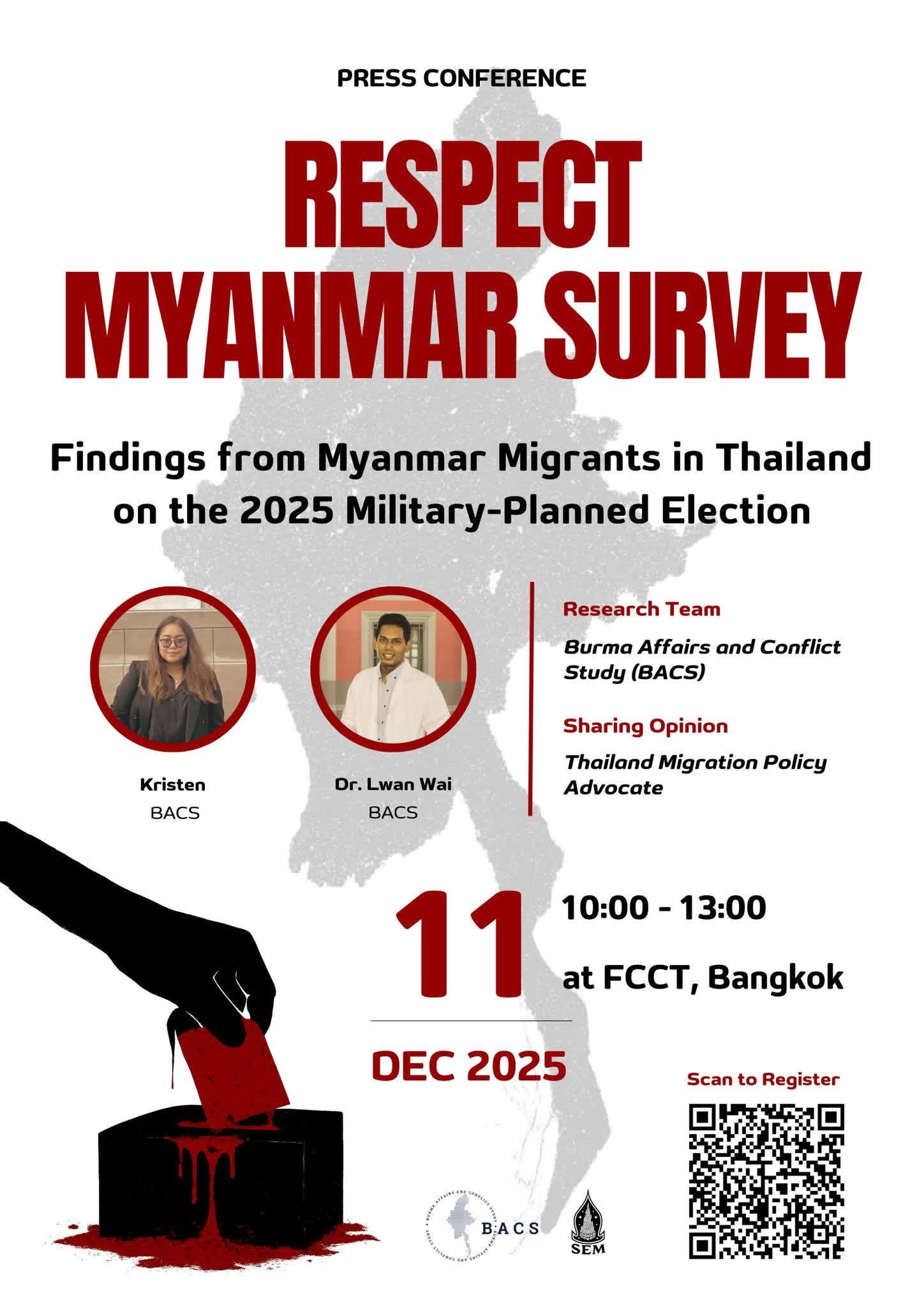 SEM would like to invite you all to join the press conference on the RESPECT Myanmar Survey – Findings from Myanmar Migrants in Thailand on the 2025 Military-Planned Election conducted and presented by Burma Affairs & Conflict Study.