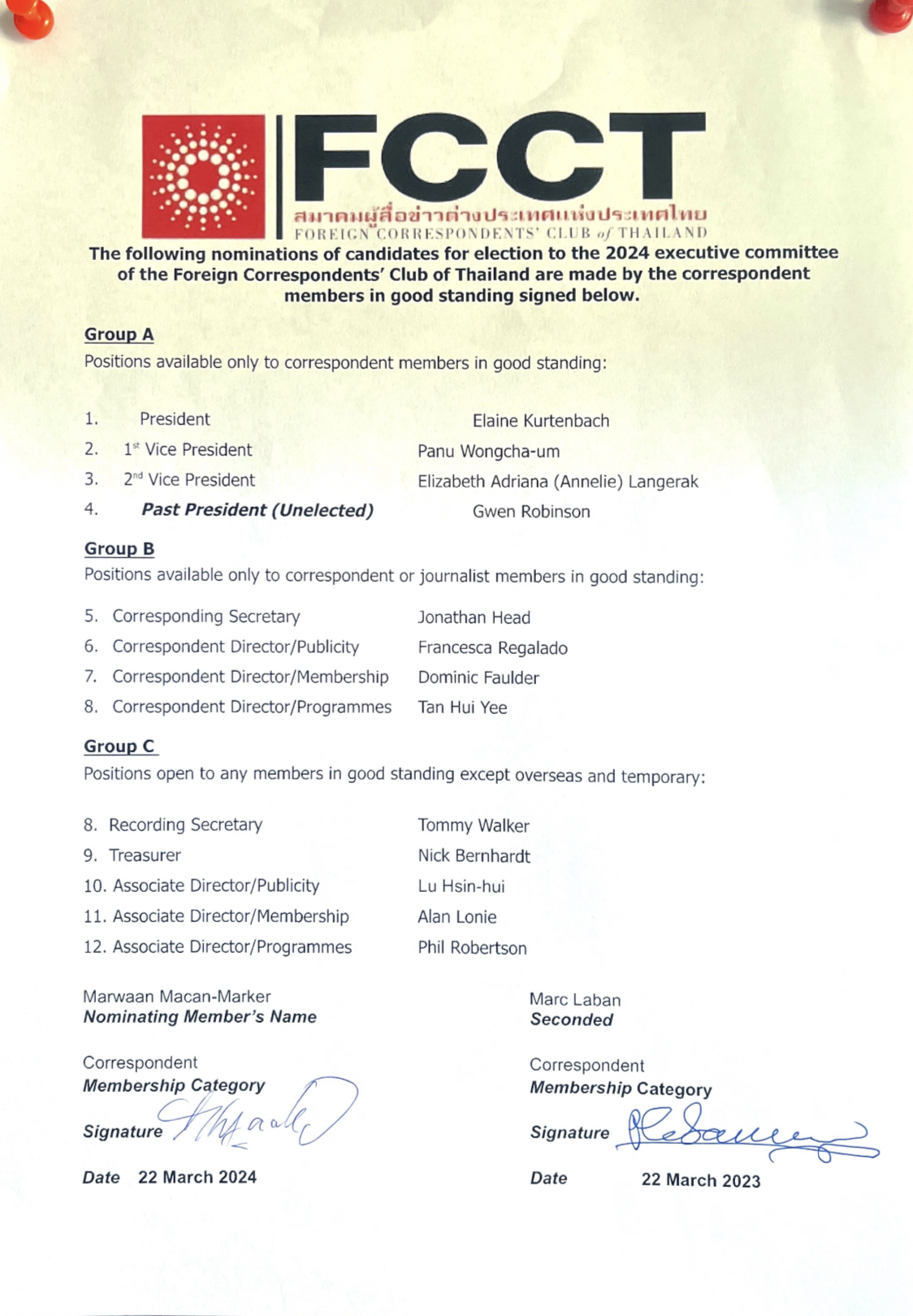 Nomination forms are available from the FCCT office. In the coming weeks, the agenda, minutes of the 2023 AGM and other related documents will be circulated. These will include absentee ballot forms for correspondent and journalist members unable to attend in person.